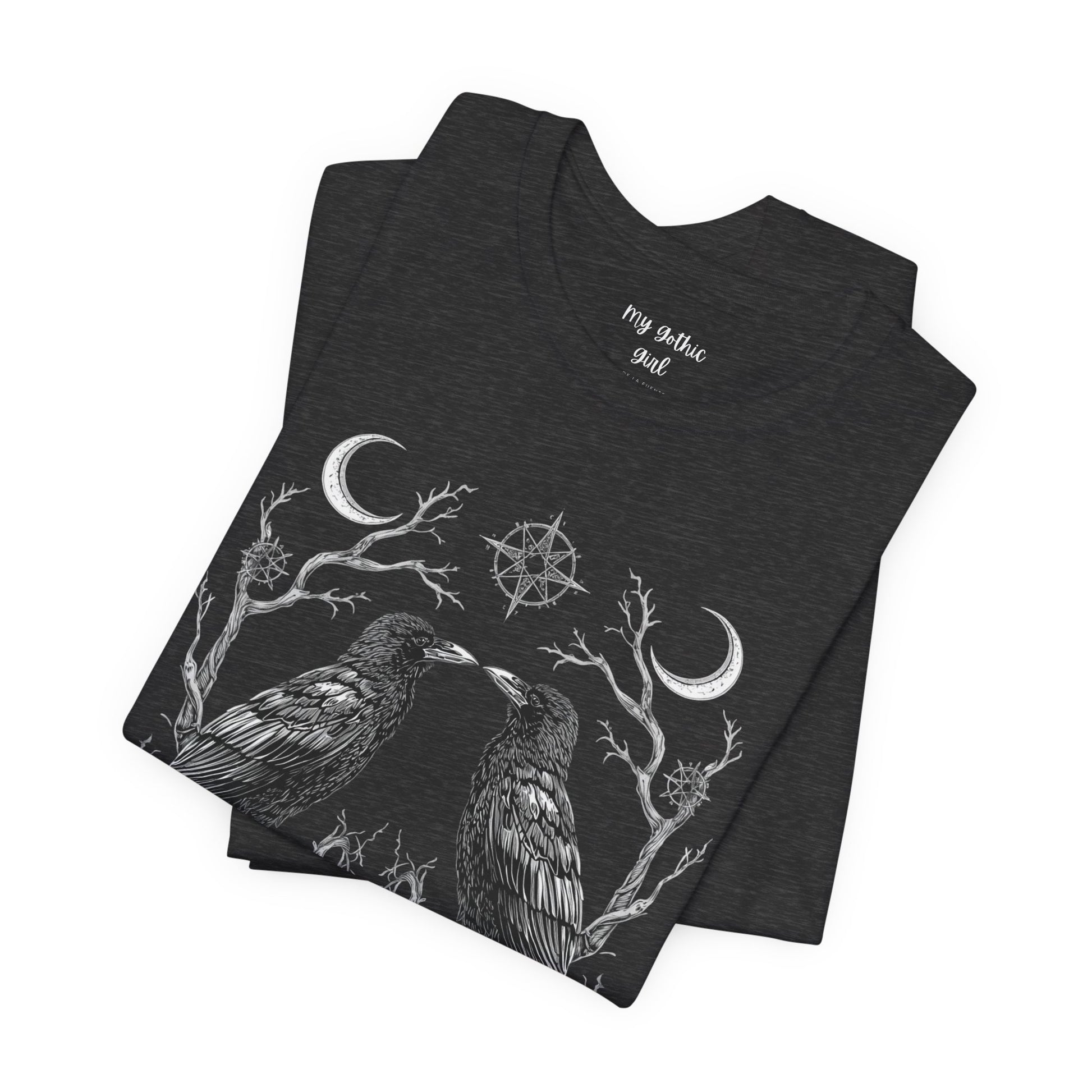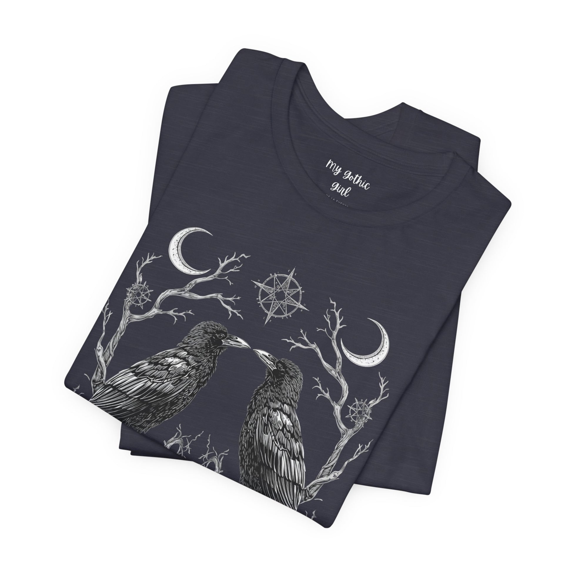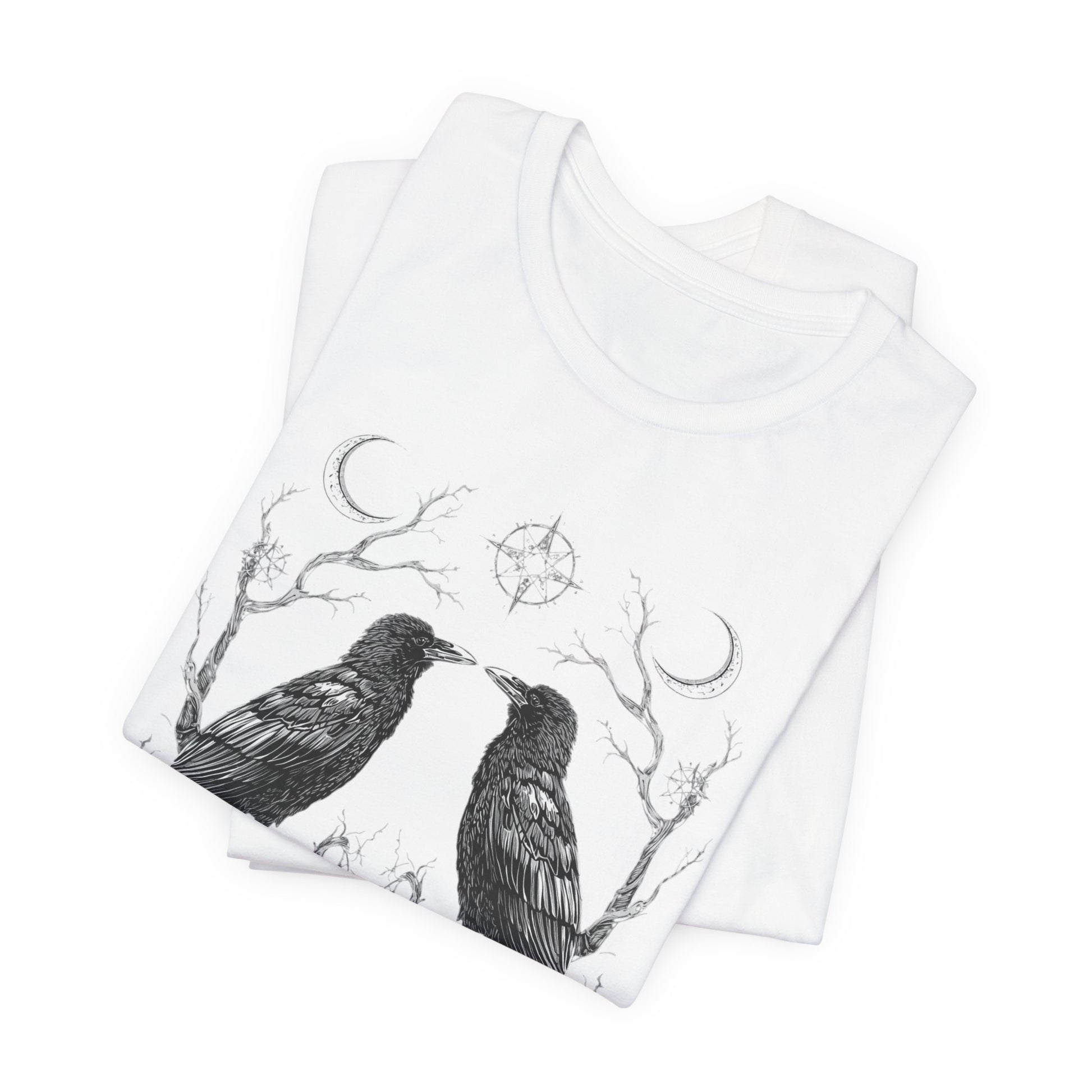 A breath of quiet mystery for those who favor nature’s darker poetry. This lightweight jersey tee features two detailed ravens mirrored over a subtle floral and branch motif — ink-fine lines that read like a sketchbook found in the woods. Wear it layered under a flannel or alone on cool mornings; the soft Airlume combed cotton feels gentle against skin while the retail crew neck keeps the look clean and easy to accessorize. The design speaks to people who love folklore, late-night walks, and the hush just after sunset. It settles into everyday life without shouting, bringing a quietly theatrical edge to casual outfits and small gatherings where stories are traded and embers glow.