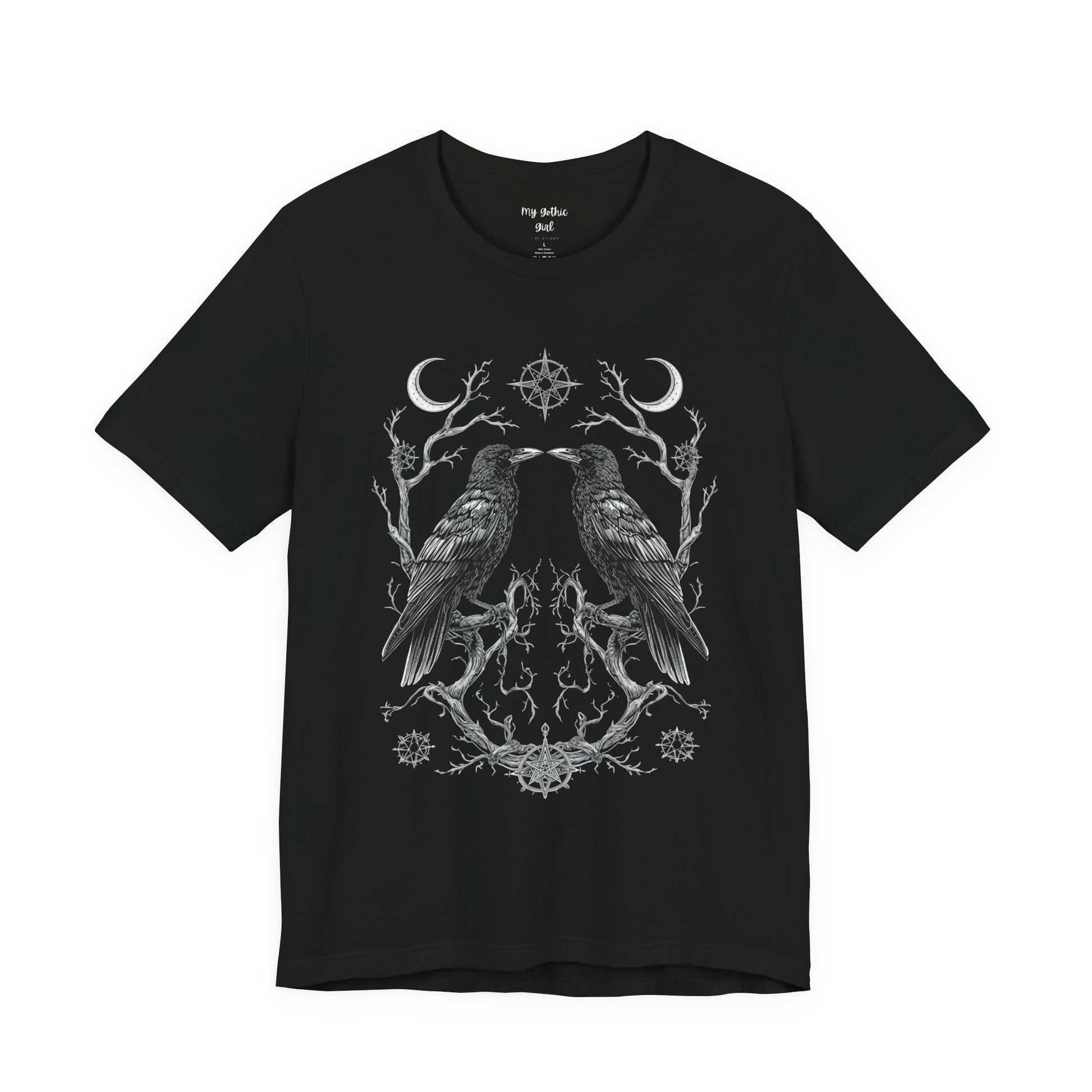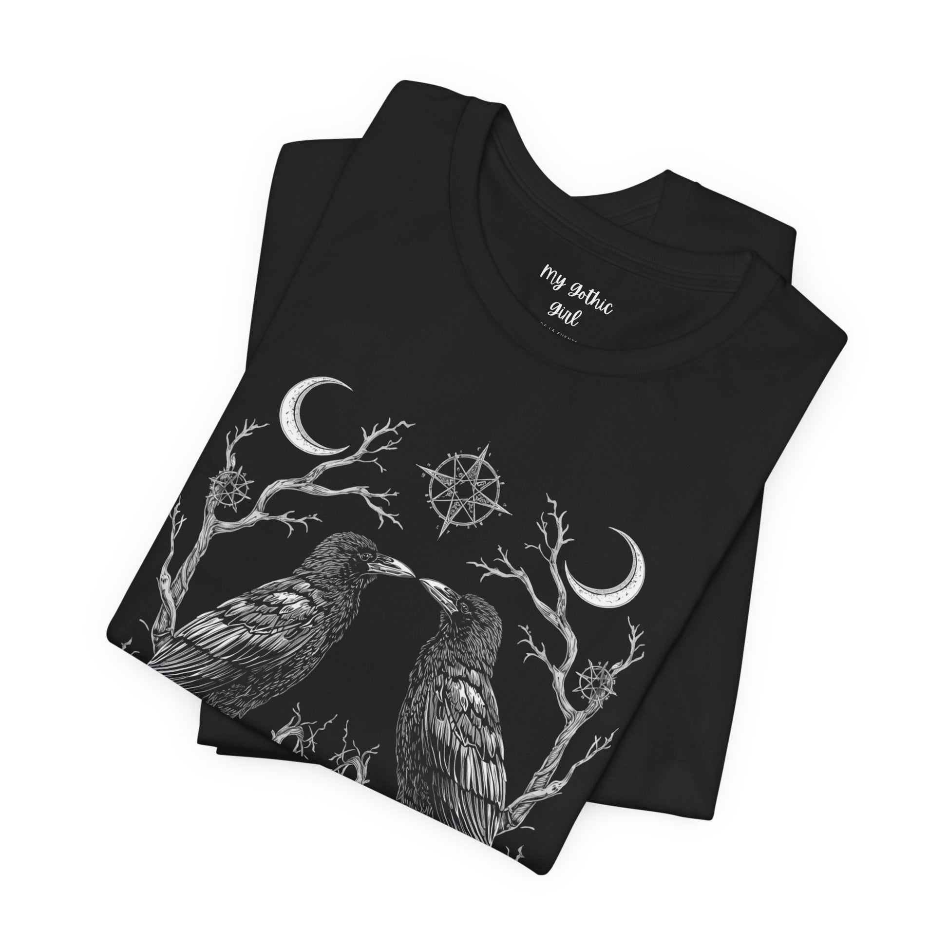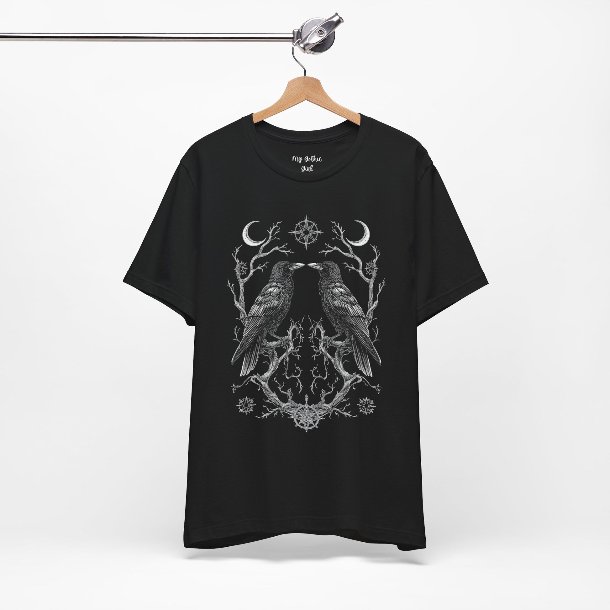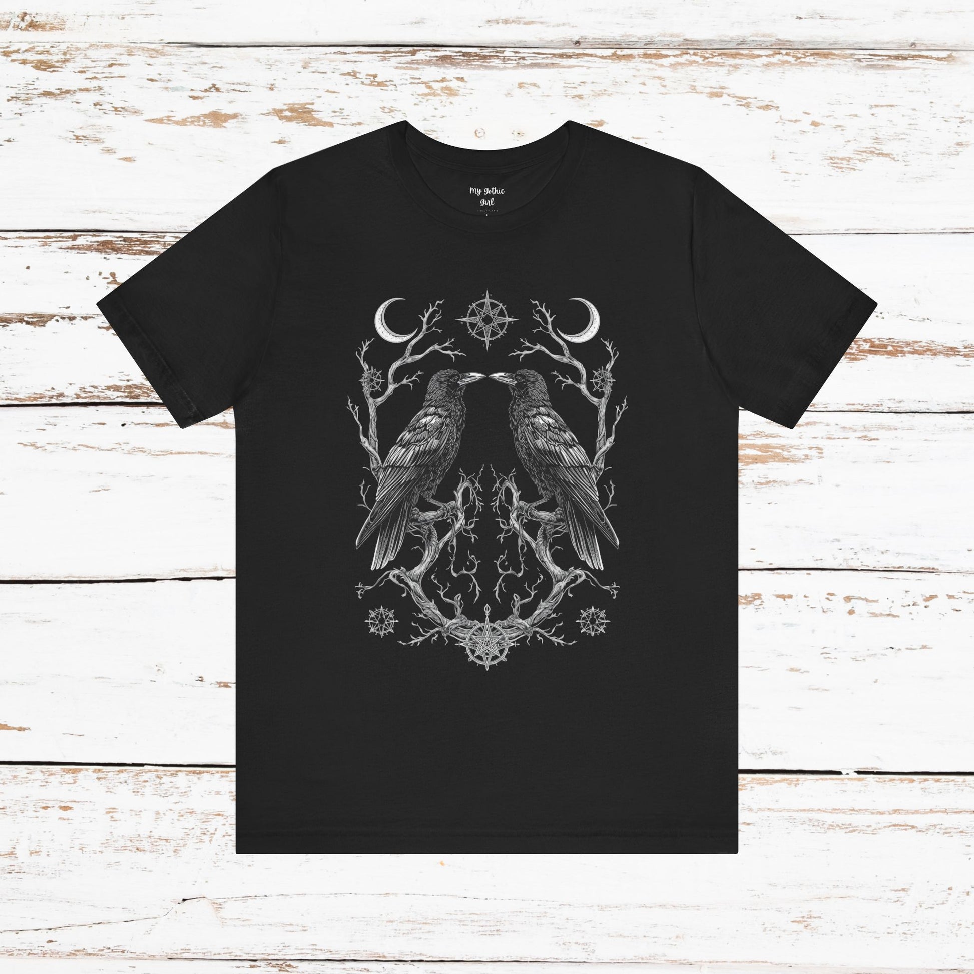 A breath of quiet mystery for those who favor nature’s darker poetry. This lightweight jersey tee features two detailed ravens mirrored over a subtle floral and branch motif — ink-fine lines that read like a sketchbook found in the woods. Wear it layered under a flannel or alone on cool mornings; the soft Airlume combed cotton feels gentle against skin while the retail crew neck keeps the look clean and easy to accessorize. The design speaks to people who love folklore, late-night walks, and the hush just after sunset. It settles into everyday life without shouting, bringing a quietly theatrical edge to casual outfits and small gatherings where stories are traded and embers glow.